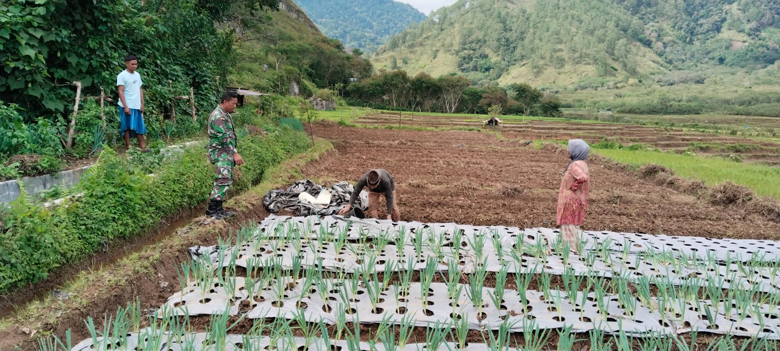 Dalam hal ini Serka Zulkarnain membantu petani dalam pemasangan plastik mulsa pada lahan yang akan ditanami bawang merah.