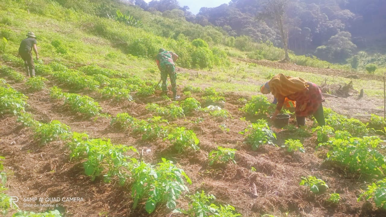 Wujud kepedulian terhadap ketahanan pangan, Babinsa Koramil 02/Bebesen terus aktif mendampingi para petani di wilayah binaannya. Kali ini, Babinsa turun langsung ke lahan pertanian warga untuk mendampingi petani dalam melakukan perawatan tanaman kentang.